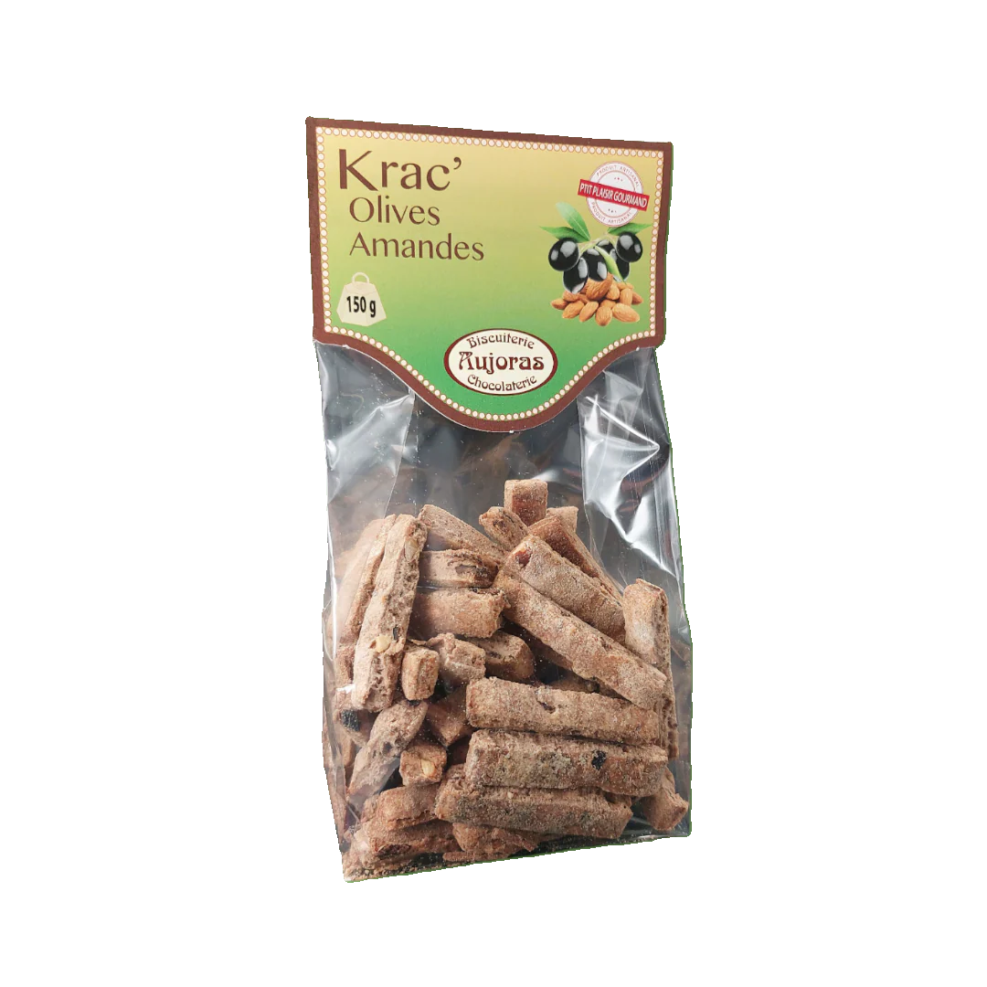 Krac‘ Olive und Mandel โ Pikante Kekse, die den mediterranen Geschmack von Oliven mit dem knackigen Geschmack von Mandeln vereinen. Jeder Bissen bietet die perfekte Balance aus Knusprigkeit und Geschmack und ist daher ideal fรผr Aperitifs, Weinbegleitungen oder jeden Anlass, der einen raffinierten und schmackhaften Snack erfordert.